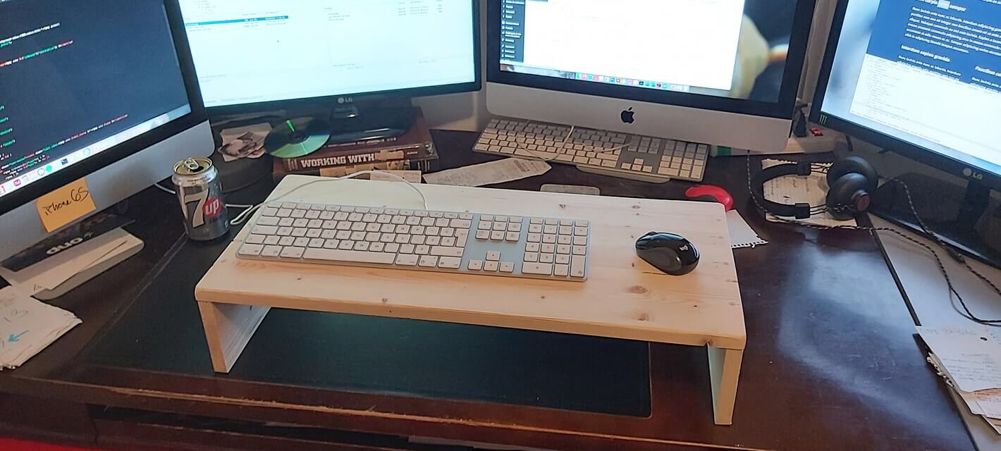 Since my day job requires me to spend hours upon hours sitting at my desk, my back tends to get into really bad and uncomfortable positions. To help keep a decent posture, I’ve built myself a small stand to raise my keyboard and mouse so I could work standing.