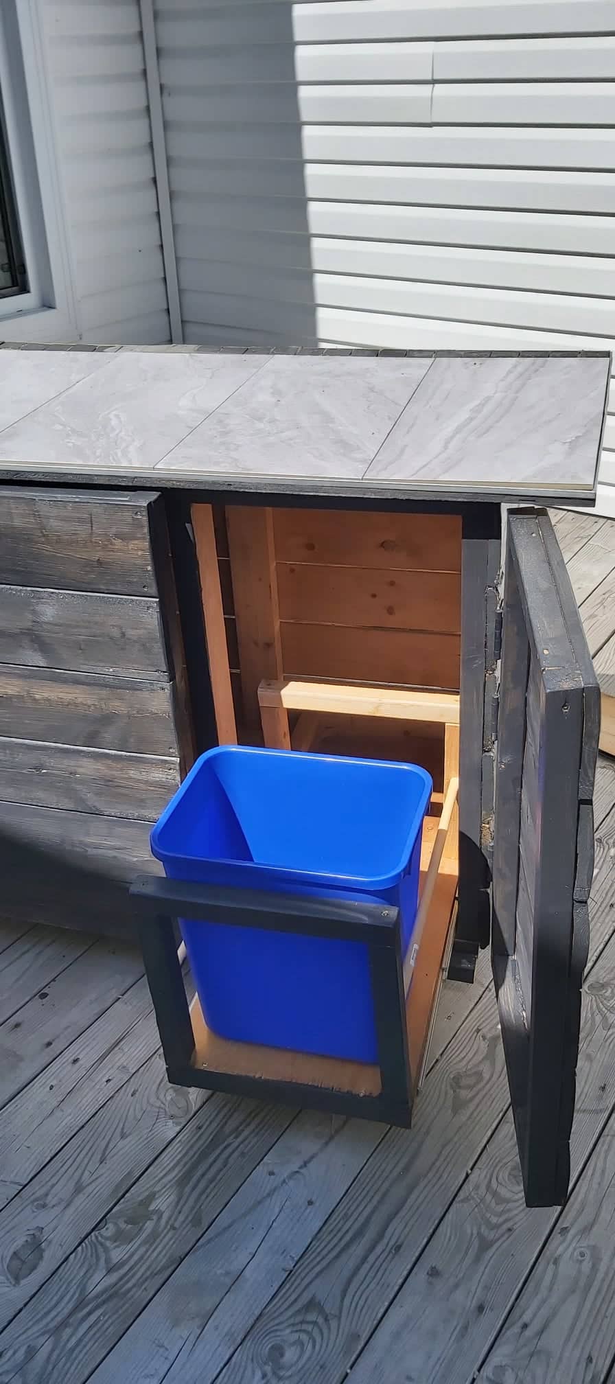 I then put my cooler inside and made sure I had proper dimensions to allow me to take it out easily to add ice or remove the water from it after use. I added a piece of 2 x 2 after the piece to server as a stopper for my doors. That turned out to be about 30 inches so I built my door the same way I built my sides. The other 24″ or so of the structure was made as another door. I built a small drawer to easily take out the trash using some scraps of 2 x 2 and plywood. Once it was built, I added some drawer slides to make everything work nice and smooth.