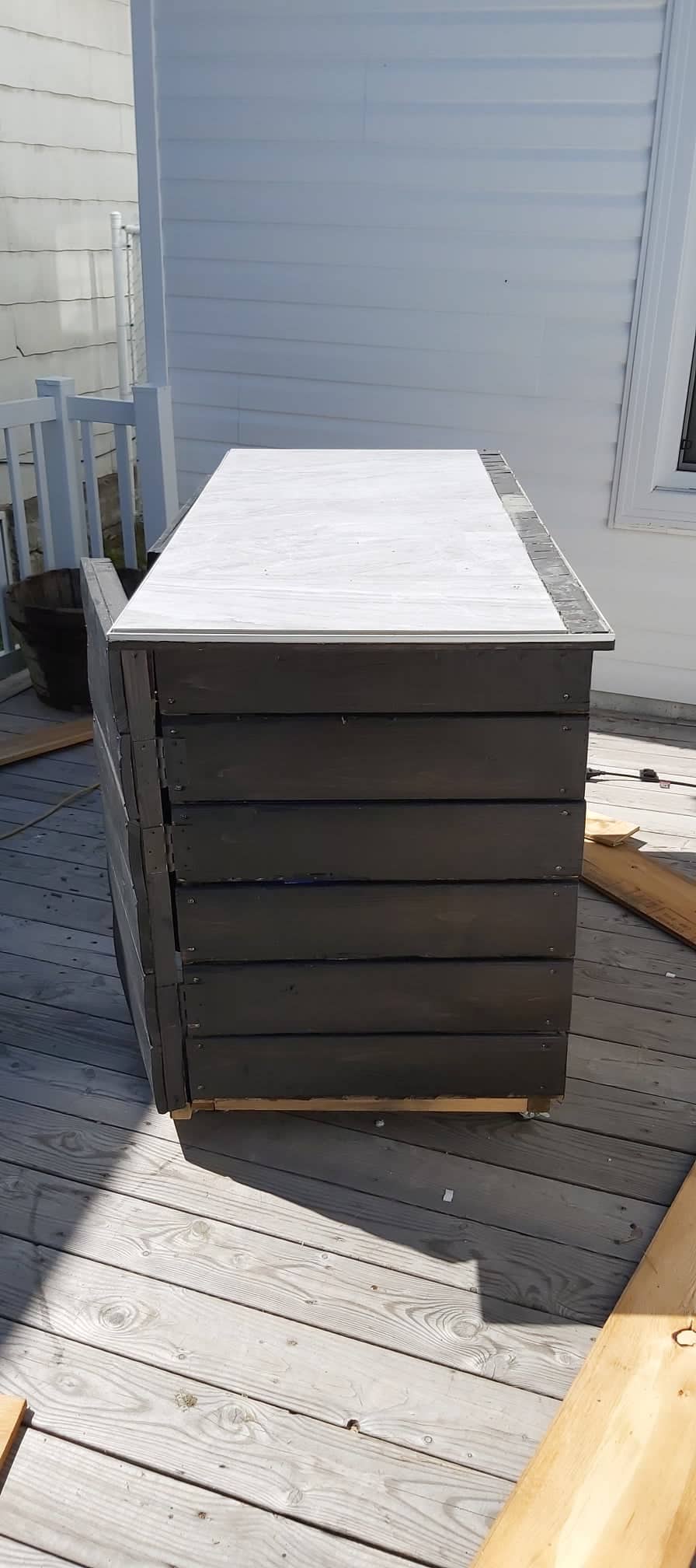 As a pile of wood started to look like something more useful, I secured in place what would be the base of the whole structure. I flipped it all over so there would be a base and added the top. I wanted it to be a few inches inches wider on 3 sides and front, leaving the back flush. This would allow to have some support on either side to move it around as well as look nice. The other main reason I wanted that was so I could have large ceramic tiles on top to serve as a counter top, and having purchased those before starting the build, it was the simplest solution.