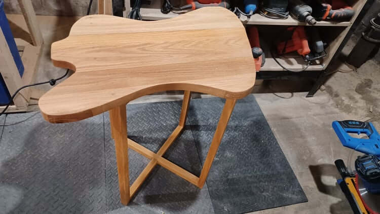 Using my jigsaw, I made a very rough outline just to remove any excess that could be in my way. Using my plunge router, I then traced the outline of the table though multiple passes, making sure I followed the outline I traced. After a few passes, I was about half depth, and about as far as my router bit would go, so I finished the cutout using my jigsaw again. I then switched to a flush trim bit to have a straighter edge. It wasn’t perfect, but I knew I would sand it afterwards so that didn’t bother me.