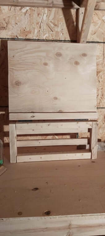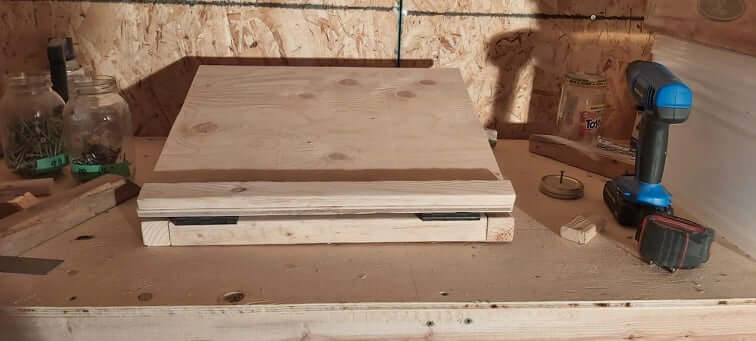 Next, I built the base by putting screws into each end of the 1 x 2 into the 2 x 2 pieces on both sides. I spaced them out somewhat equally. I finished the base by adding the remaining 2 x 2 pieces along the insides. I then screwed the hinges to the top and secured it to the base.
